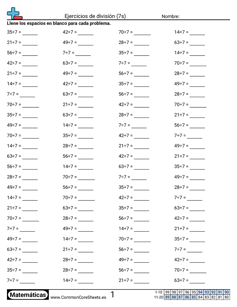 Cada hoja tiene 100 problemas para dividir por 7.