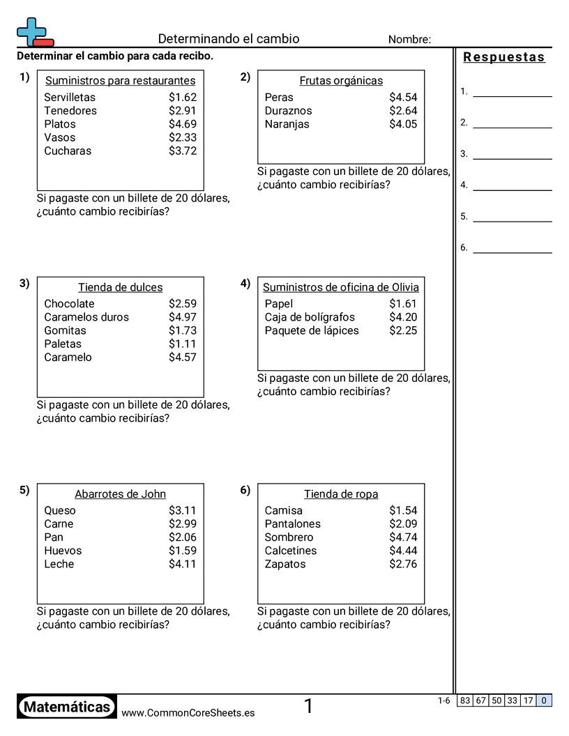Cada hoja tiene 6 problemas que determinan el cambio recibido usando un recibo.