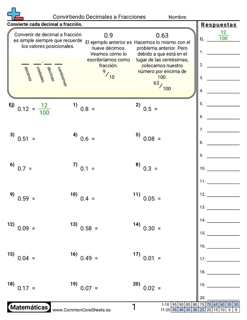 Cada hoja tiene 20 problemas de convertir un decimal a su forma de fracción.