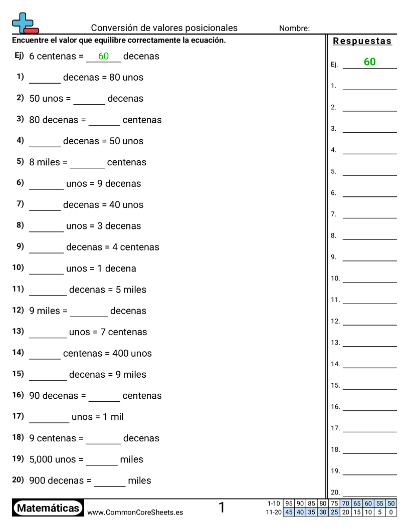 Hojas de trabajo gratis de math sobre Conversión de valores posicionales. Cada hoja tiene 20 ejercicios con hoja de respuestas y es ideal para maestros y educación en casa. Puedes descargar el PDF, crear tarjetas de memoria o configurarlo para aprendizaje en línea.