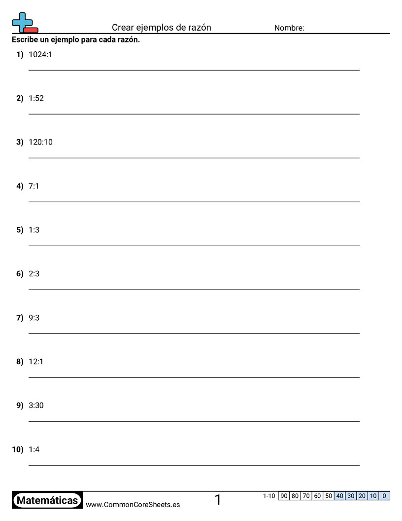 Hojas de trabajo gratis de math para 6to Grado (6rp1) sobre Crear ejemplos de razón. Cada hoja tiene 10 ejercicios con hoja de respuestas y es ideal para maestros y educación en casa. Puedes descargar el PDF, crear tarjetas de memoria o configurarlo para aprendizaje en línea.