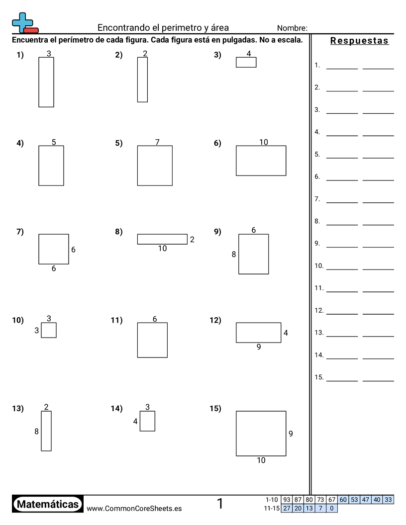 Cada hoja contiene 15 problemas para encontrar el área y el perímetro de un rectángulo.