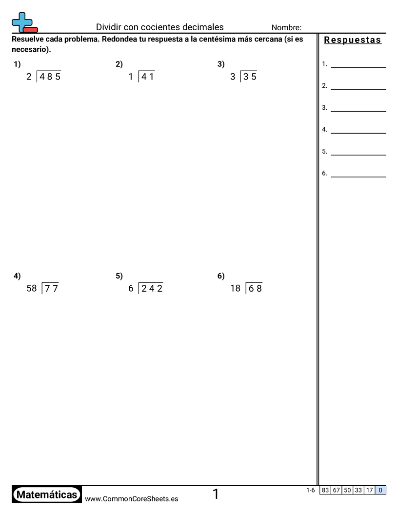 Hojas de trabajo gratis de math sobre Dividir con cocientes decimales. Cada hoja tiene 6 ejercicios con hoja de respuestas y es ideal para maestros y educación en casa. Puedes descargar el PDF, crear tarjetas de memoria o configurarlo para aprendizaje en línea.
