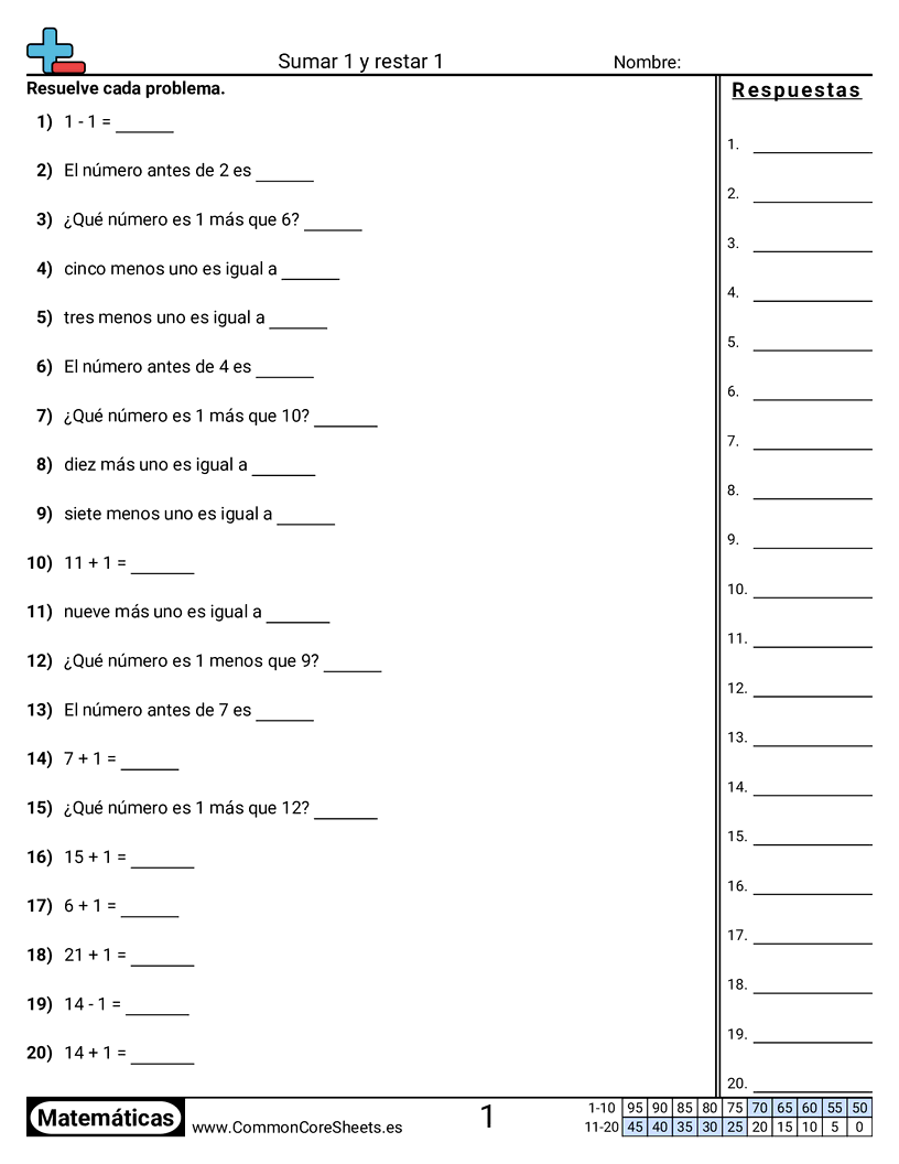 Hojas de trabajo gratis de math para Jardín de infantes () sobre Sumar 1 y restar 1. Cada hoja tiene 20 ejercicios con hoja de respuestas y es ideal para maestros y educación en casa. Puedes descargar el PDF, crear tarjetas de memoria o configurarlo para aprendizaje en línea.