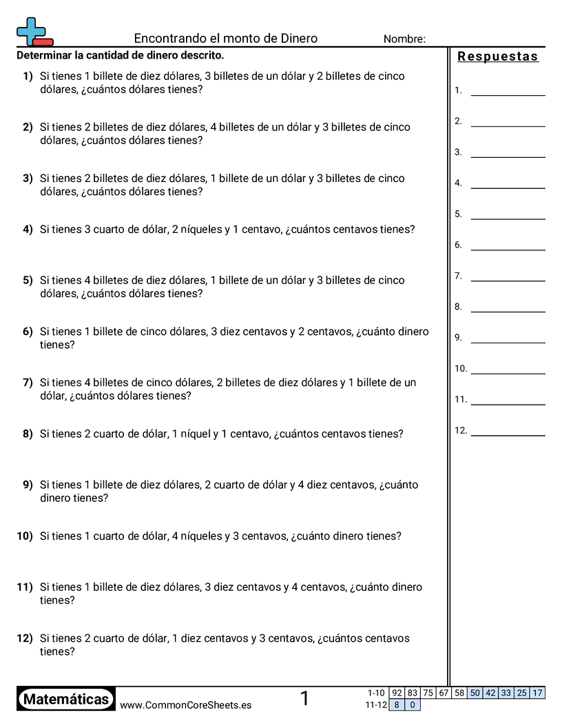 Hojas de trabajo gratis de math para 2do Grado (2md8) sobre Encontrando el monto de Dinero. Cada hoja tiene 12 ejercicios con hoja de respuestas y es ideal para maestros y educación en casa. Puedes descargar el PDF, crear tarjetas de memoria o configurarlo para aprendizaje en línea.