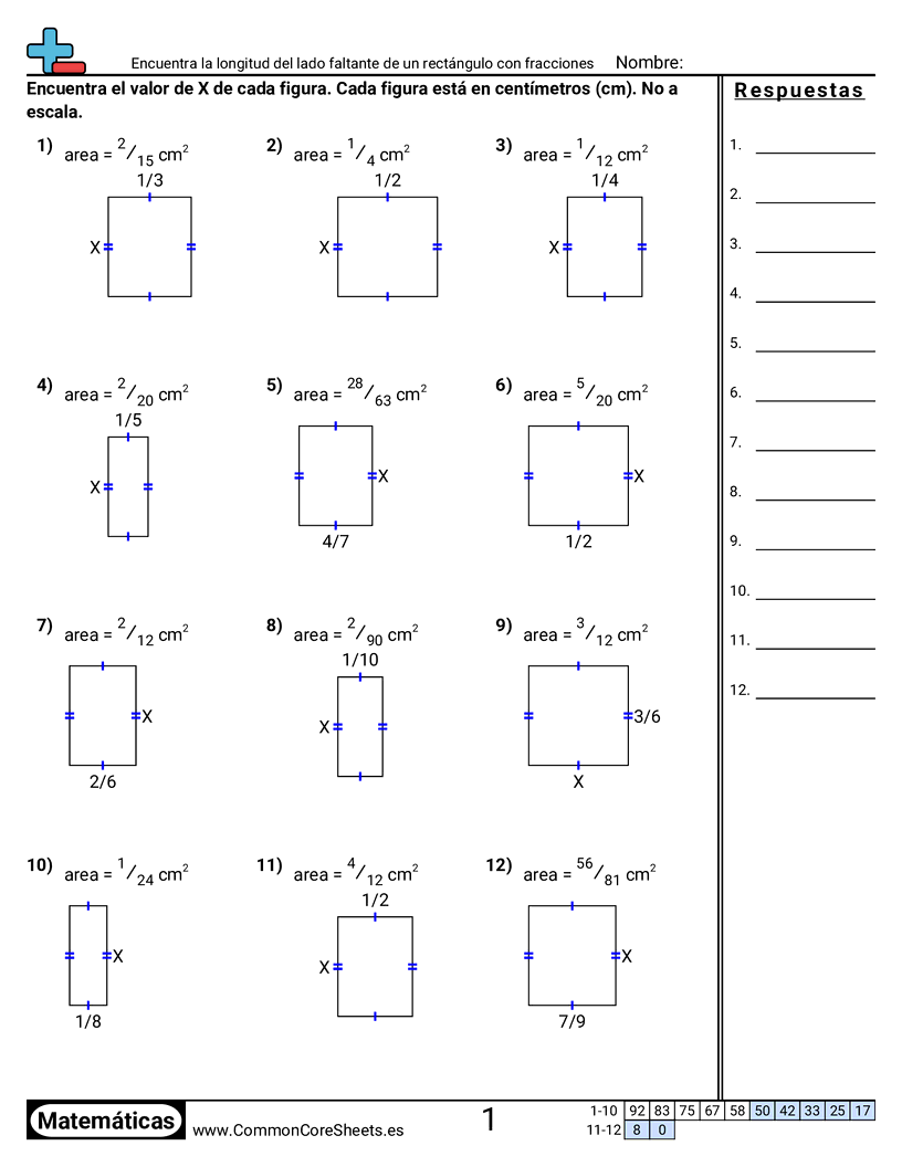 Hojas de trabajo gratis de math sobre Encuentra la longitud del lado faltante de un rectángulo con fracciones. Cada hoja tiene 12 ejercicios con hoja de respuestas y es ideal para maestros y educación en casa. Puedes descargar el PDF, crear tarjetas de memoria o configurarlo para aprendizaje en línea.