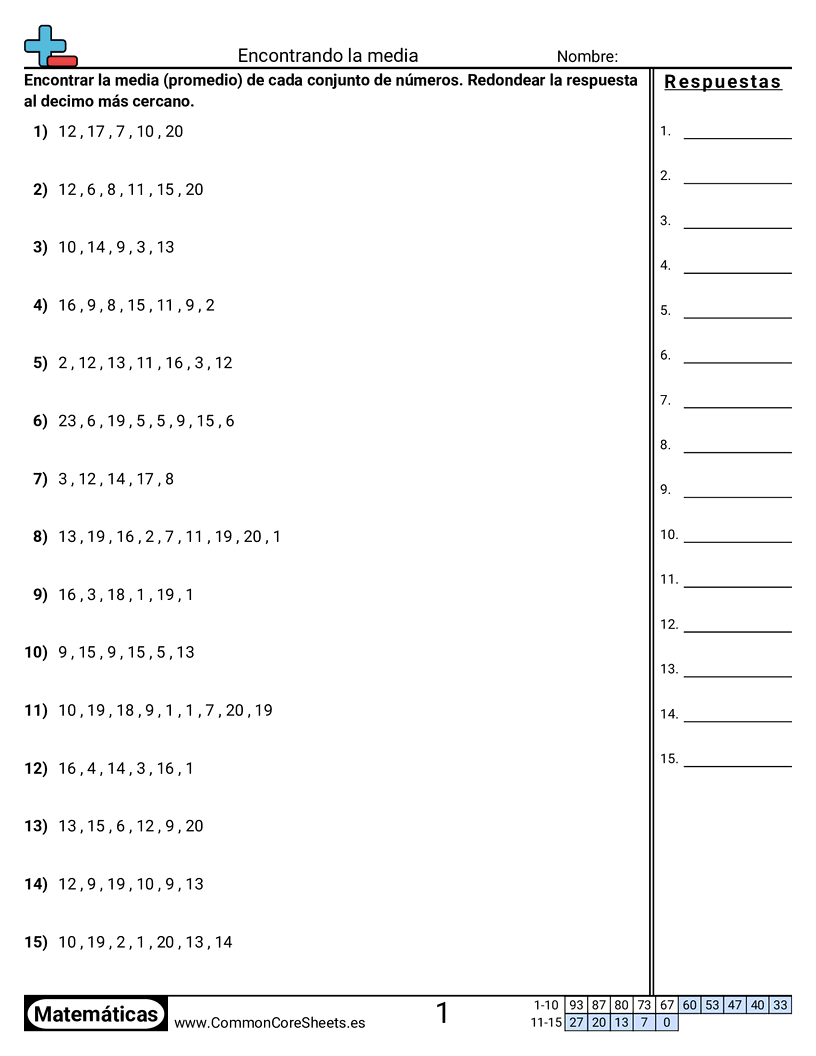 Cada hoja tiene 15 problemas para encontrar la media de un conjunto de números.