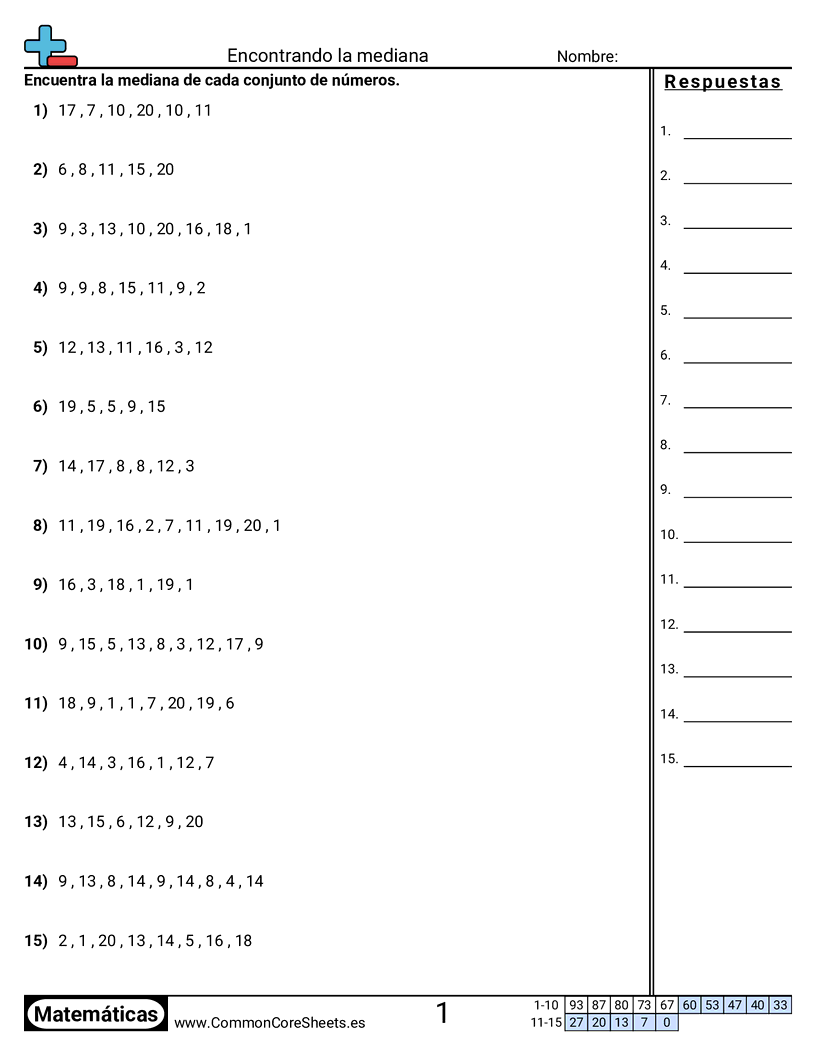 Hojas de trabajo gratis de math para 6to Grado (6sp5c) sobre Encontrando la mediana. Cada hoja tiene 15 ejercicios con hoja de respuestas y es ideal para maestros y educación en casa. Puedes descargar el PDF, crear tarjetas de memoria o configurarlo para aprendizaje en línea.