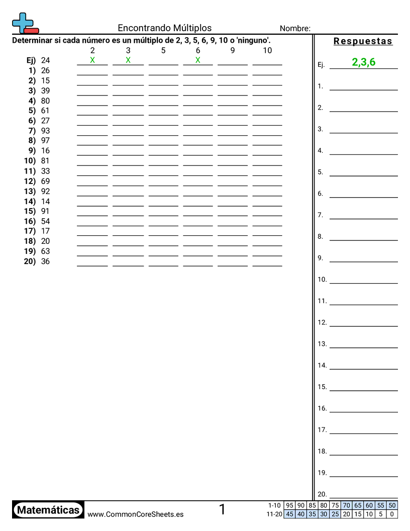 Cada hoja de cálculo contiene 20 problemas para determinar si un número es un múltiplo de 2, 3, 5, 6, 9 y 10.