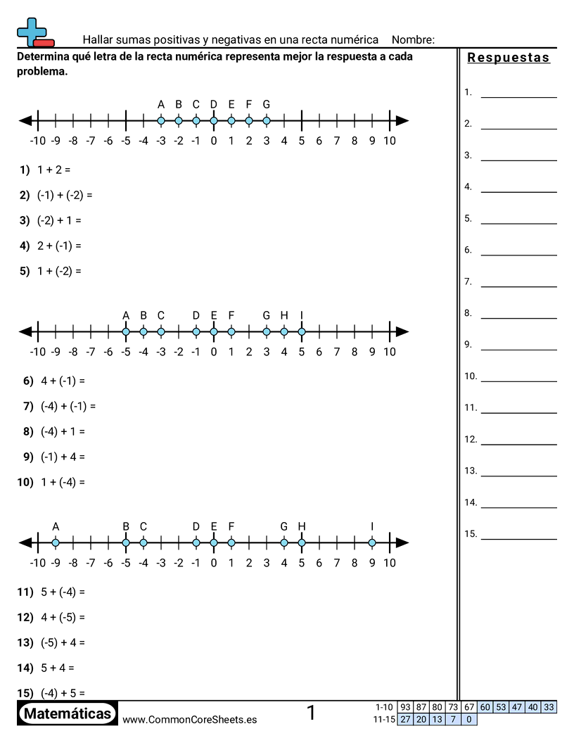 Hojas de trabajo gratis de math para 7mo Grado (7ns1b) sobre Hallar sumas positivas y negativas en una recta numérica. Cada hoja tiene 15 ejercicios con hoja de respuestas y es ideal para maestros y educación en casa. Puedes descargar el PDF, crear tarjetas de memoria o configurarlo para aprendizaje en línea.