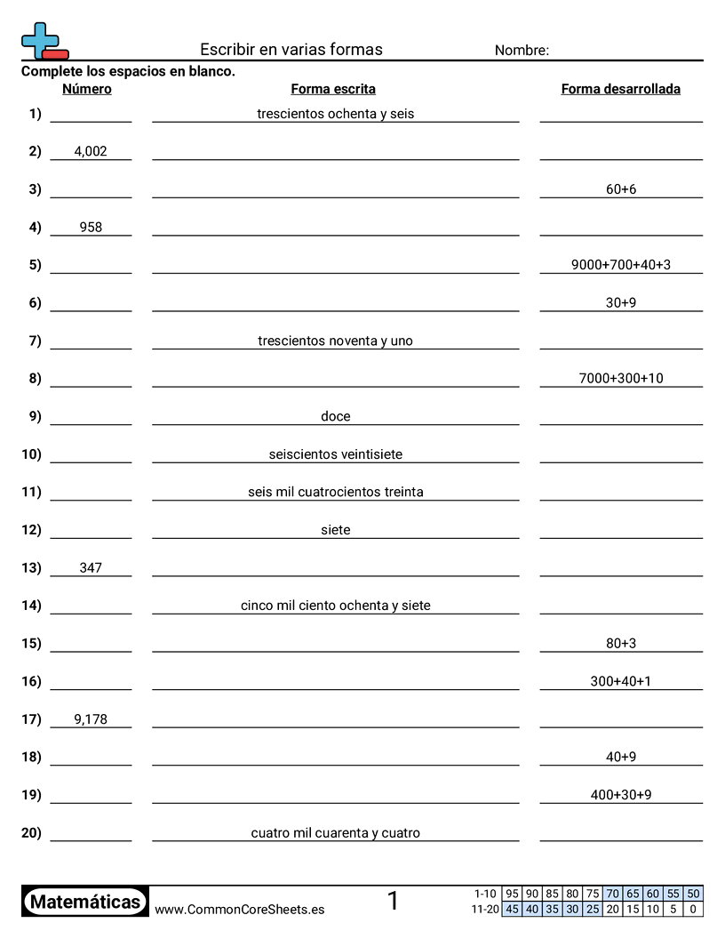 Hojas de trabajo gratis de math sobre Escribir en varias formas. Cada hoja tiene 20 ejercicios con hoja de respuestas y es ideal para maestros y educación en casa. Puedes descargar el PDF, crear tarjetas de memoria o configurarlo para aprendizaje en línea.