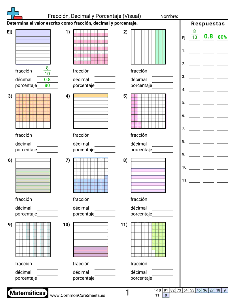 Hojas de trabajo gratis de math para 4to Grado (4nf6) sobre Fracción, Decimal y Porcentaje (Visual). Cada hoja tiene 11 ejercicios con hoja de respuestas y es ideal para maestros y educación en casa. Puedes descargar el PDF, crear tarjetas de memoria o configurarlo para aprendizaje en línea.