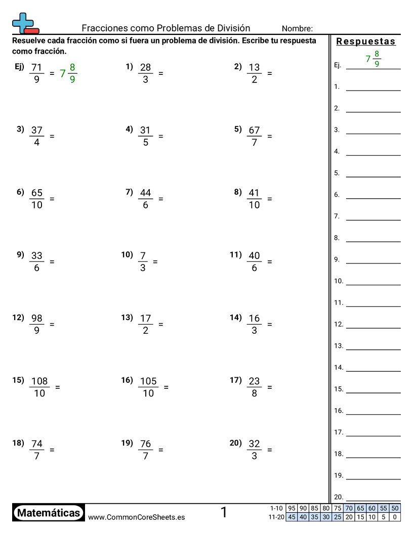 Cada hoja tiene 20 problemas de solucionar una fracción como si fuera un problema de división.