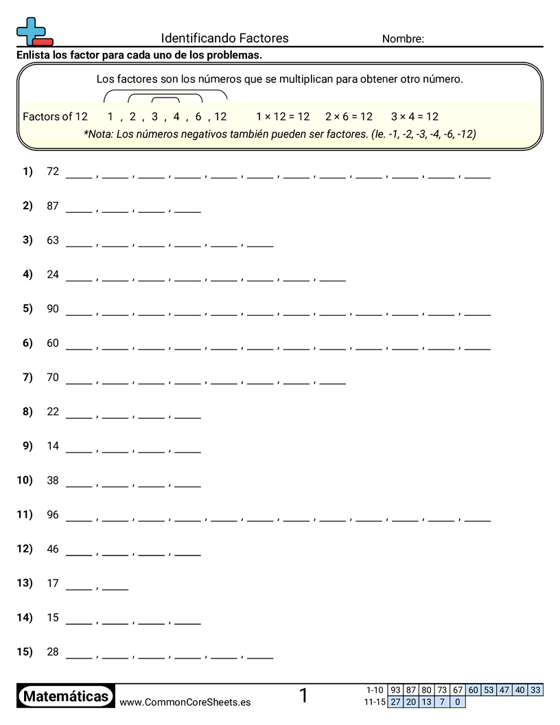 Cada hoja contiene 15 problemas para identificar los factores de un número. Los espacios en blanco son proporcionados por la cantidad de factores.