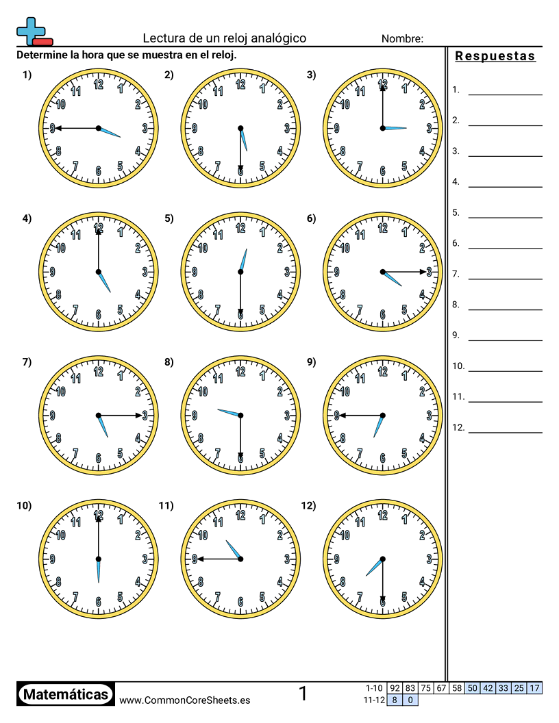 Hojas de trabajo gratis de math para 2do Grado (2md7) sobre Lectura de un reloj analógico. Cada hoja tiene 12 ejercicios con hoja de respuestas y es ideal para maestros y educación en casa. Puedes descargar el PDF, crear tarjetas de memoria o configurarlo para aprendizaje en línea.