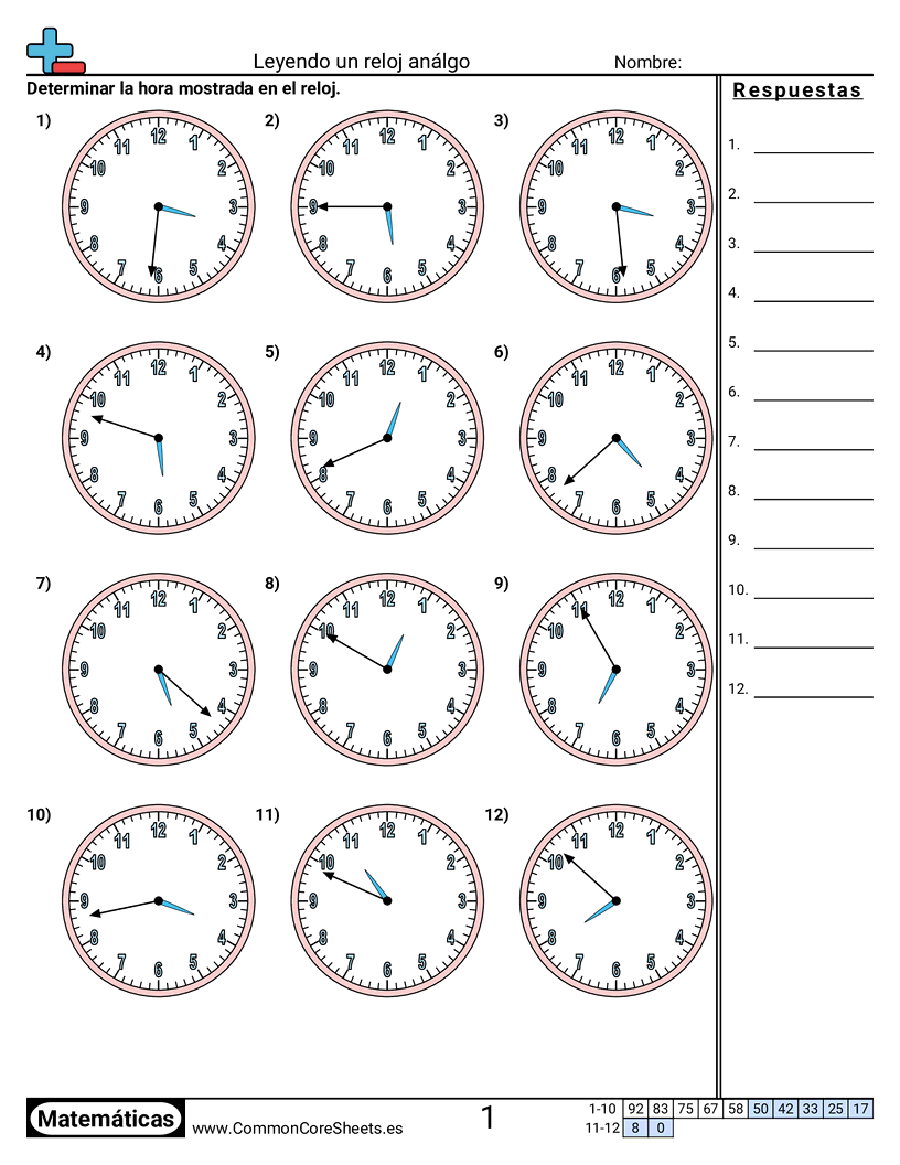 Hojas de trabajo gratis de math sobre Leyendo un reloj análgo. Cada hoja tiene 12 ejercicios con hoja de respuestas y es ideal para maestros y educación en casa. Puedes descargar el PDF, crear tarjetas de memoria o configurarlo para aprendizaje en línea.