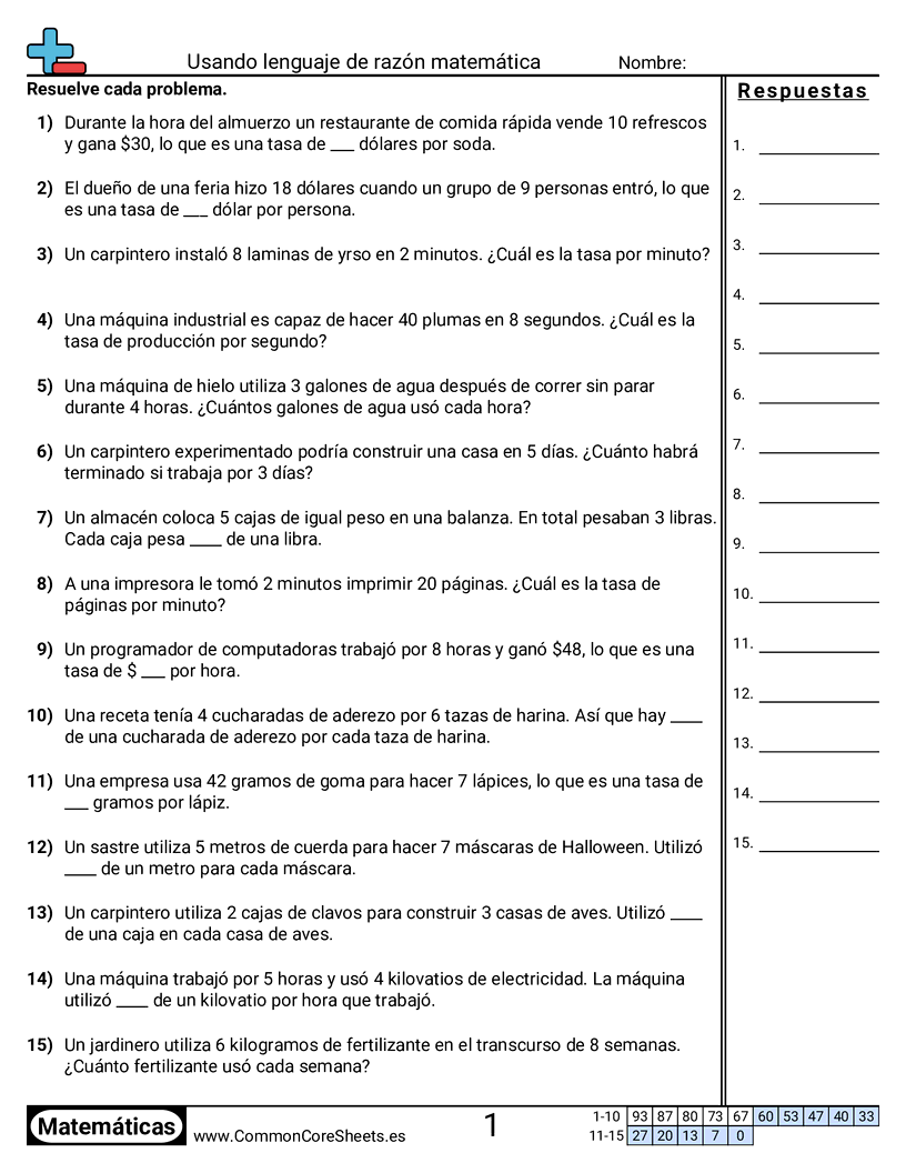 Hojas de trabajo gratis de math para 6to Grado (6rp2) sobre Usando lenguaje de razón matemática. Cada hoja tiene 15 ejercicios con hoja de respuestas y es ideal para maestros y educación en casa. Puedes descargar el PDF, crear tarjetas de memoria o configurarlo para aprendizaje en línea.