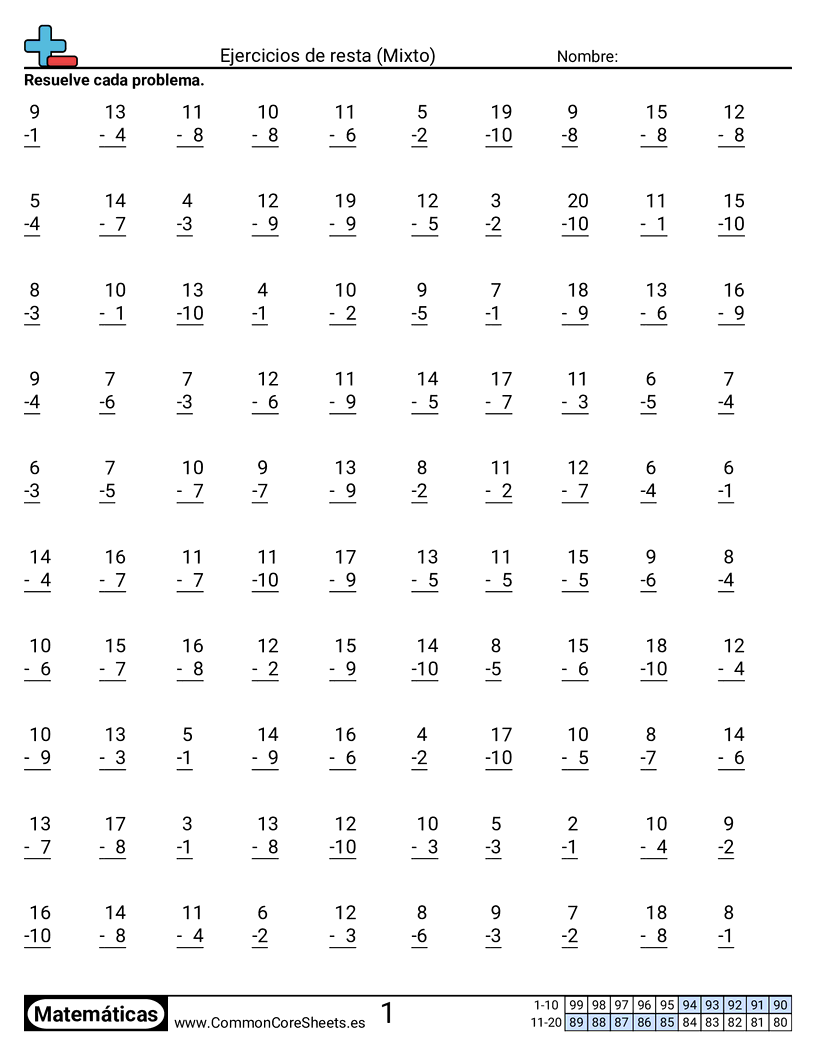 Hojas de trabajo gratis de math sobre Ejercicios de resta (Mixto) . Cada hoja tiene 100 ejercicios con hoja de respuestas y es ideal para maestros y educación en casa. Puedes descargar el PDF, crear tarjetas de memoria o configurarlo para aprendizaje en línea.