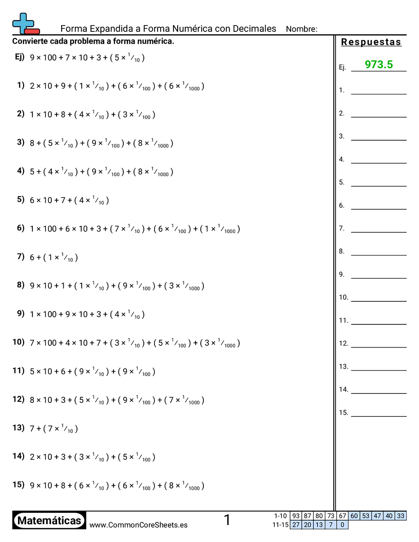 Hojas de trabajo gratis de math para 5to Grado (5nbt3a) sobre Forma Expandida a Forma Numérica con Decimales. Cada hoja tiene 15 ejercicios con hoja de respuestas y es ideal para maestros y educación en casa. Puedes descargar el PDF, crear tarjetas de memoria o configurarlo para aprendizaje en línea.