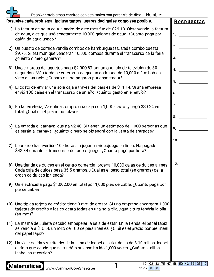 Hojas de trabajo gratis de math para 5to Grado (5nbt2) sobre Resolver problemas escritos con decimales con potencia de diez. Cada hoja tiene 12 ejercicios con hoja de respuestas y es ideal para maestros y educación en casa. Puedes descargar el PDF, crear tarjetas de memoria o configurarlo para aprendizaje en línea.