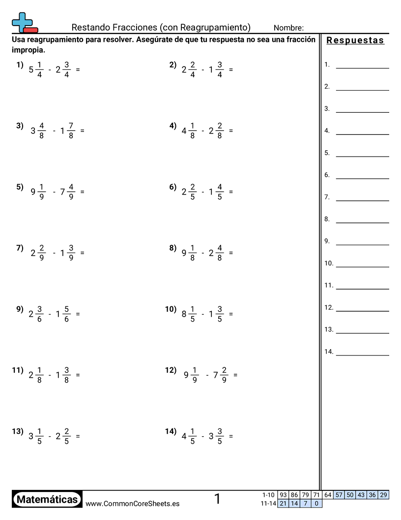 Hojas de trabajo gratis de math para 4to Grado (4nf3c) sobre Restando Fracciones (con Reagrupamiento). Cada hoja tiene 14 ejercicios con hoja de respuestas y es ideal para maestros y educación en casa. Puedes descargar el PDF, crear tarjetas de memoria o configurarlo para aprendizaje en línea.