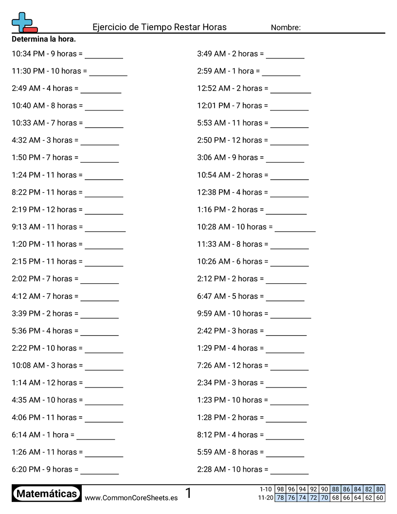 Cada hoja tiene 50 problemas de resta de horas con un reloj de 12 horas.