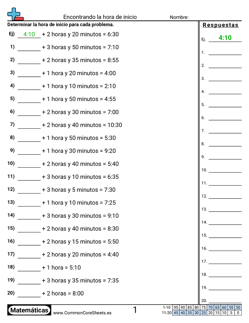 Cada hoja tiene 20 problemas para determinar la hora de inicio.