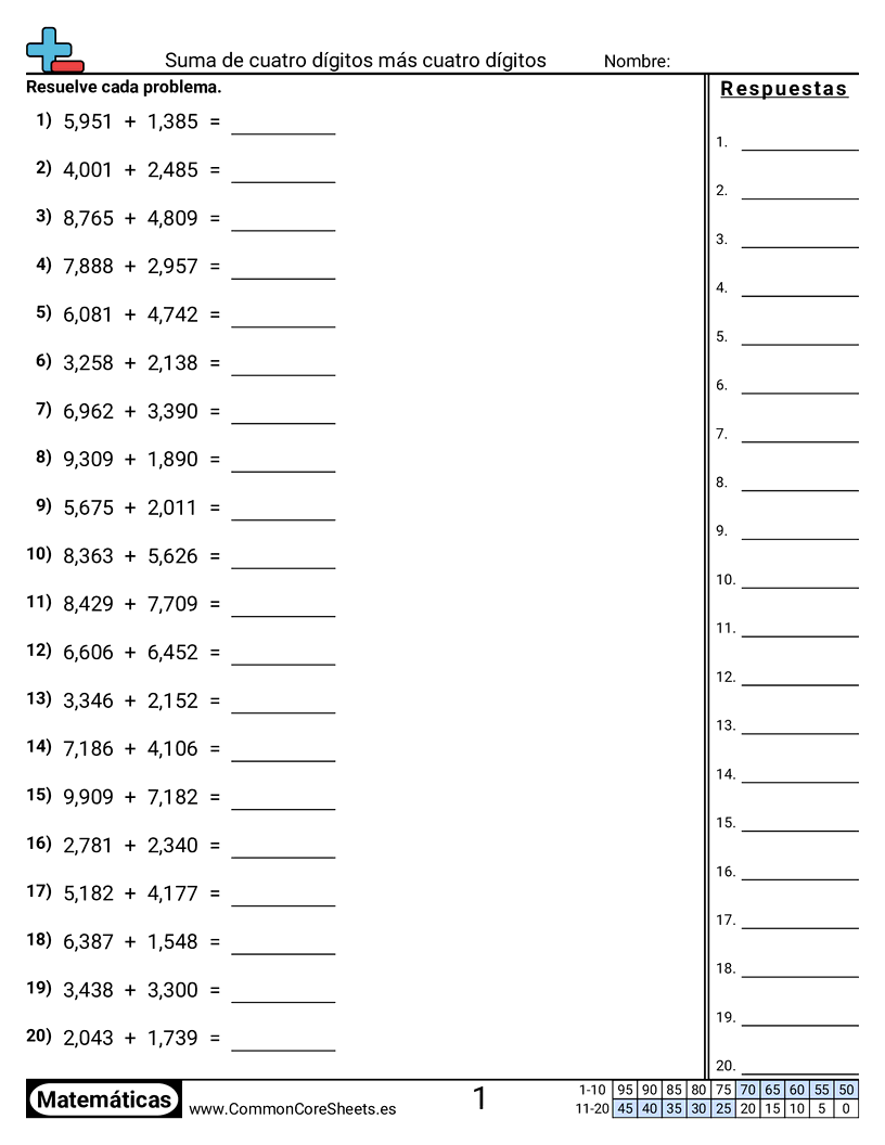 Cada hoja tiene 20 problemas con sumandos entre 1000 y 9999.