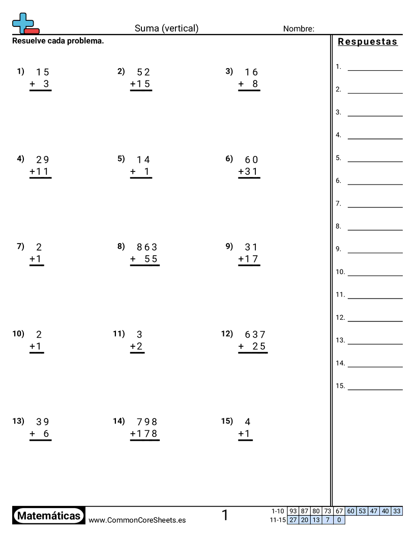 Hojas de trabajo gratis de math sobre Suma (vertical). Cada hoja tiene 15 ejercicios con hoja de respuestas y es ideal para maestros y educación en casa. Puedes descargar el PDF, crear tarjetas de memoria o configurarlo para aprendizaje en línea.