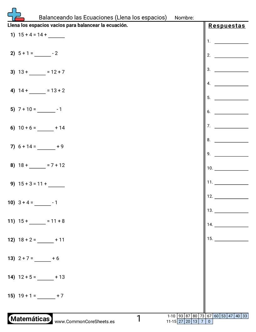 Hojas de trabajo gratis de math para 1er Grado (1oa7) sobre Balanceando las Ecuaciones (Llena los espacios). Cada hoja tiene 15 ejercicios con hoja de respuestas y es ideal para maestros y educación en casa. Puedes descargar el PDF, crear tarjetas de memoria o configurarlo para aprendizaje en línea.