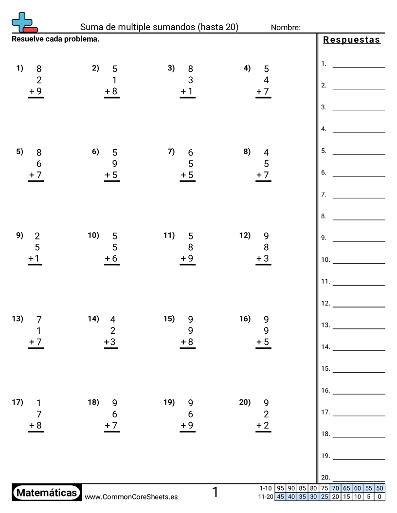 Hojas de trabajo gratis de math para 1er Grado (1oa2) sobre Suma de multiple sumandos (hasta 20). Cada hoja tiene 20 ejercicios con hoja de respuestas y es ideal para maestros y educación en casa. Puedes descargar el PDF, crear tarjetas de memoria o configurarlo para aprendizaje en línea.