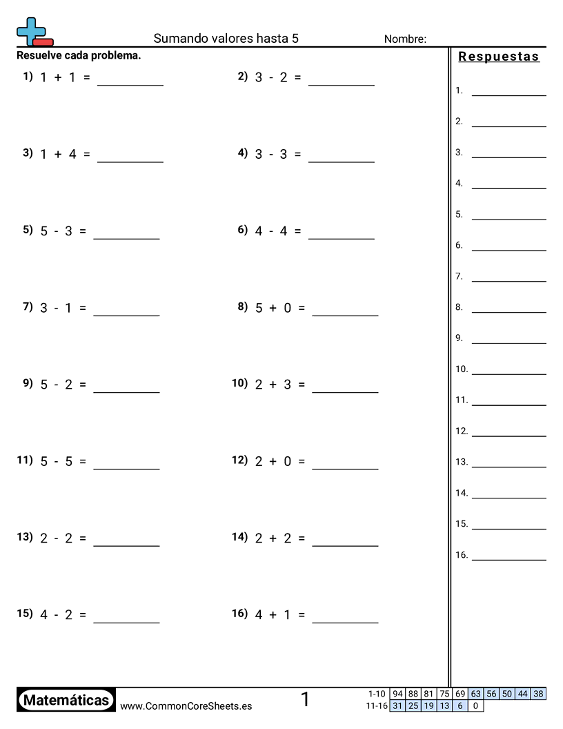 Hojas de trabajo gratis de math para Jardín de infantes (koa5) sobre Sumando valores hasta 5. Cada hoja tiene 16 ejercicios con hoja de respuestas y es ideal para maestros y educación en casa. Puedes descargar el PDF, crear tarjetas de memoria o configurarlo para aprendizaje en línea.