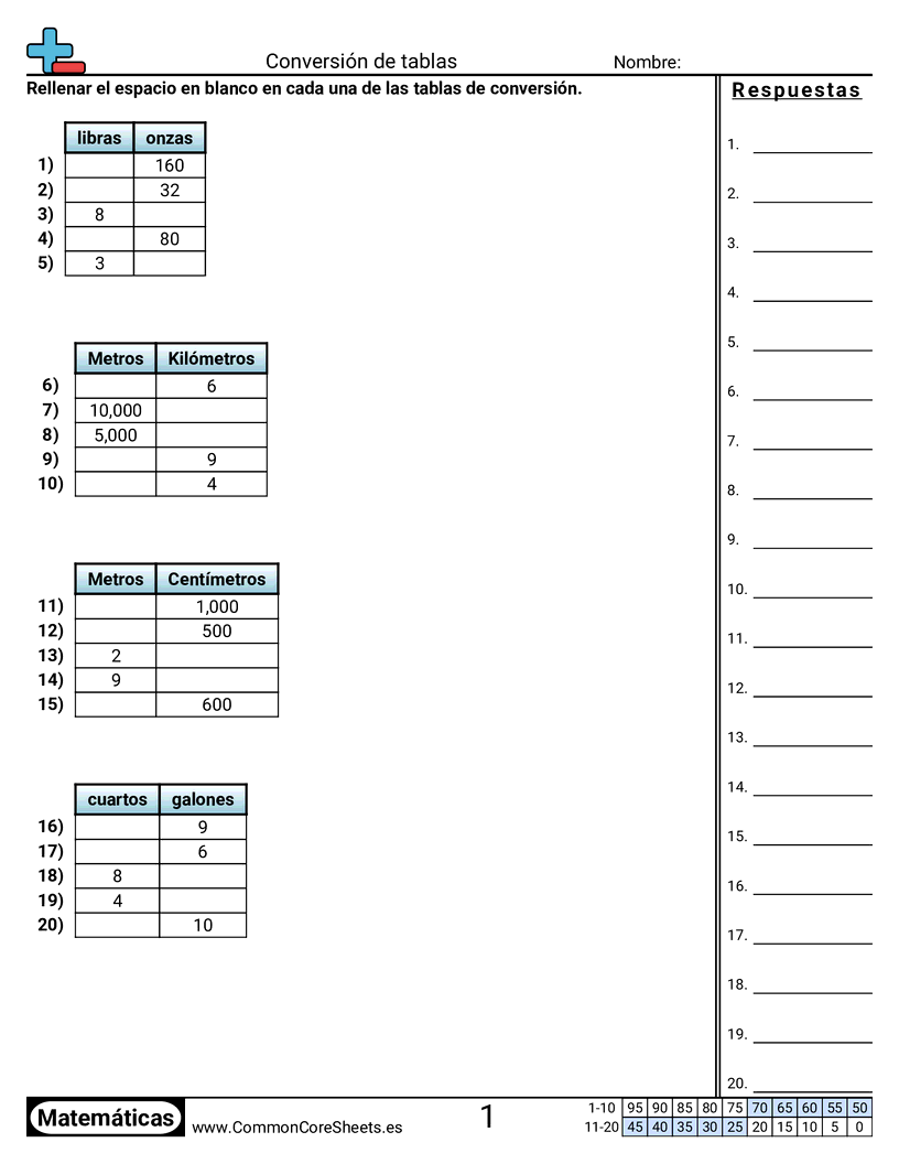 Hojas de trabajo gratis de math para 4to Grado (4md1) sobre Conversión de tablas. Cada hoja tiene 20 ejercicios con hoja de respuestas y es ideal para maestros y educación en casa. Puedes descargar el PDF, crear tarjetas de memoria o configurarlo para aprendizaje en línea.
